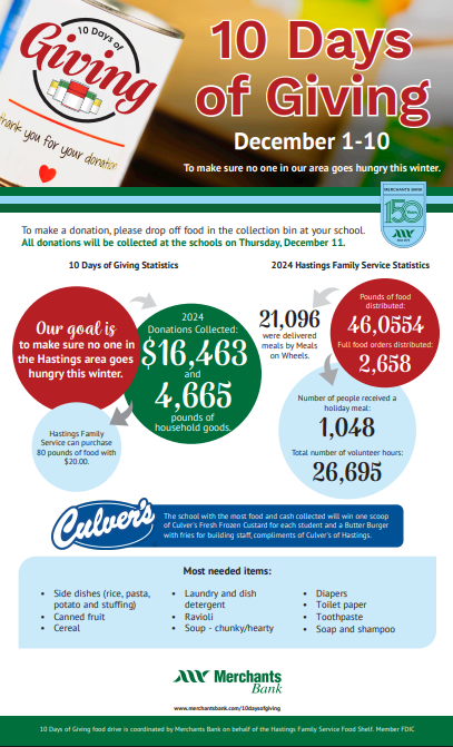 Our Goal: to make sure no one in the Hastings area goes hungry this winter. Collection bins are located near the main office and in the cafeteria thru December 10th. ♥ See the attached flyer for a list of most needed items. 🤍