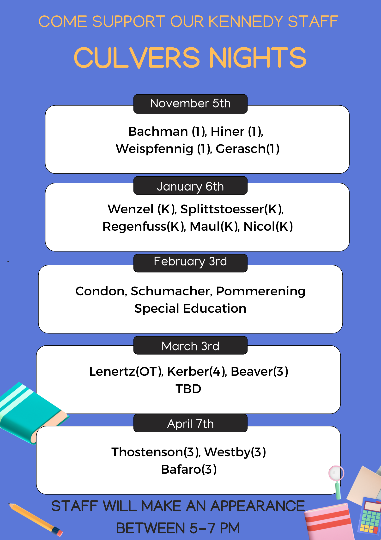 Save the Dates for our PTA Events this year! 📅 We will need volunteers for many events. Check the list below & mark your calendars. Sign-Up Genius will be posted on our Facebook page as we get closer. 😊 Feb. 2nd - 7p - Monthly Meeting Feb. 3rd - Culvers Night Feb 19 - Book Bingo* Mar. 3rd - Culvers Night Mar. 26th - Family STEAM Night* Apr. 6th - 7p - Monthly Meeting Apr. 7th - Culvers Night