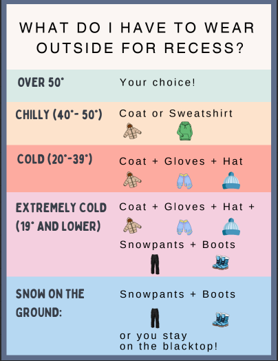 During the winter months, your child needs to wear a coat, mittens/gloves, snow pants and boots since the children will go outside for recess unless the wind chill temperature is below -11°. Once it snows, children who do not have boots or snow pants will need to stay on the blacktop area.