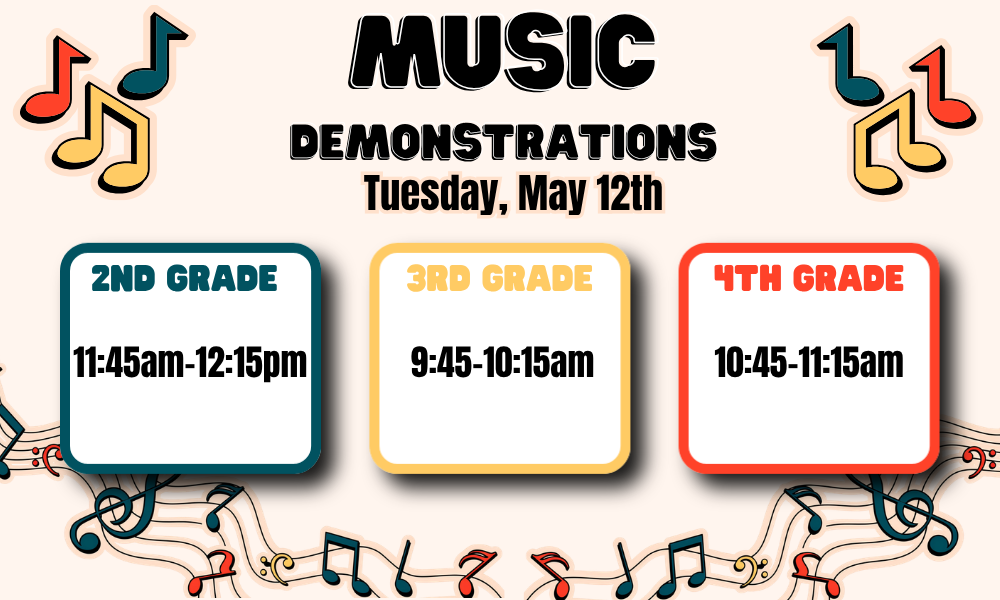 From April 20th-23rd, we will be having our Kindergarten and 1st Grade music “informances” This is an opportunity to spend music class with your child to watch them sing, play instruments, and have some fun! Please see the schedule below to identify your student's informance time. We ask that you arrive no earlier than 10 minutes before the scheduled start time. All informances are located in the music room. When you arrive, we ask that you wait in the lobby to be escorted to the music room. You will also be escorted back to the main doors to exit the school after the informances are done. Second, Third, and Fourth grade music demonstrations will be held in on May 12th. If you have any questions, comments, or concerns, please reach out,