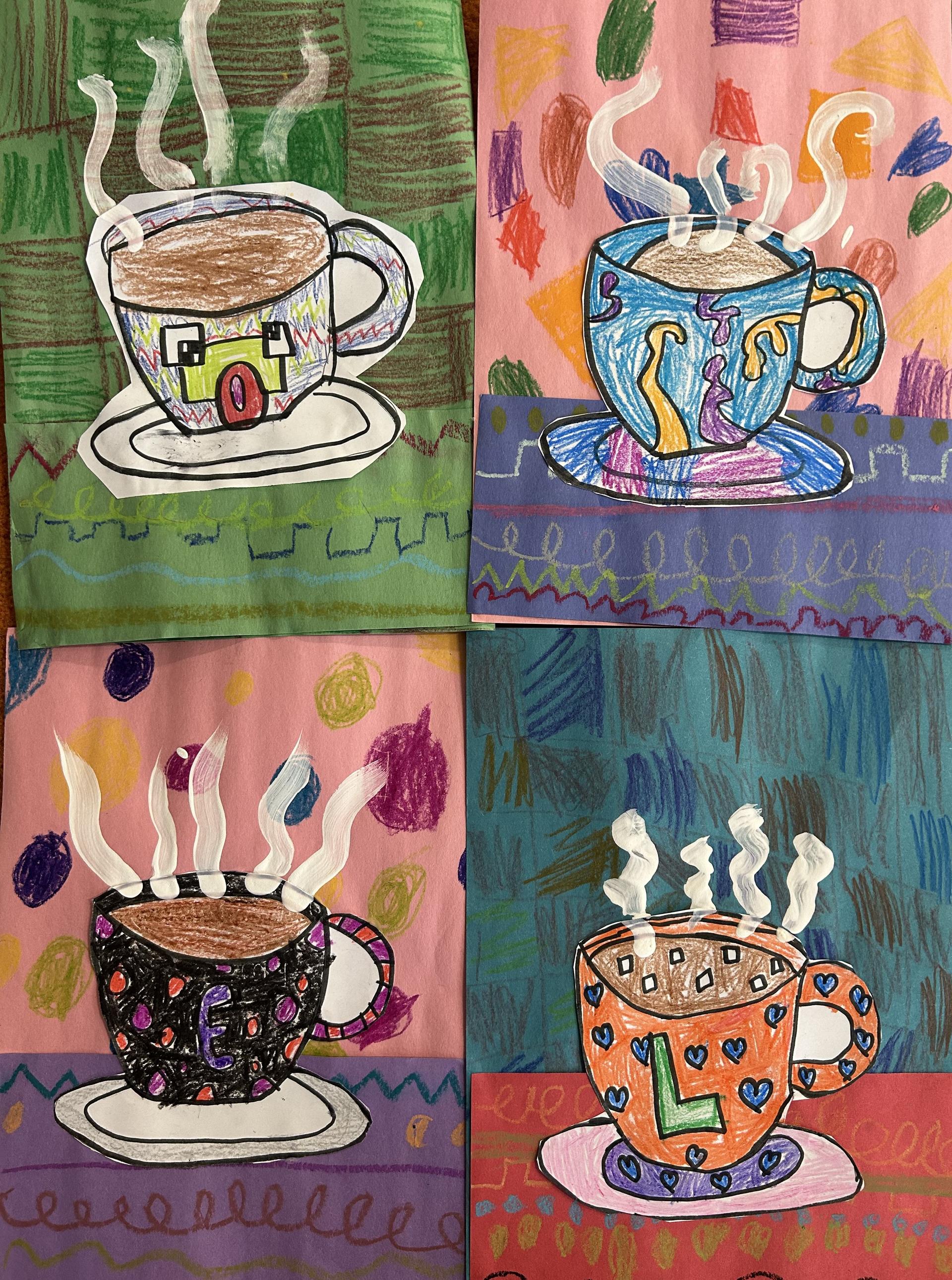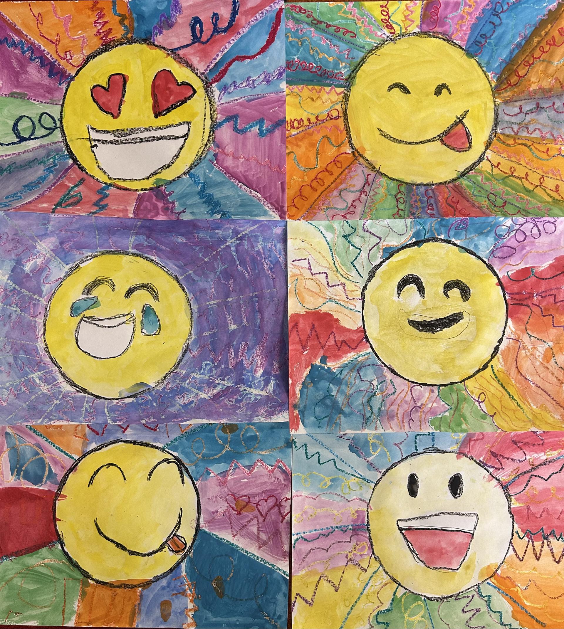 1st graders were inspired by the artist Heather Galler for their LINE art projects! She is an artist who fills her artwork with all sorts of lines, shapes, colors, patterns, and details! We took all of that as inspiration as we drew and designed our Cup of Hot Chocolate art project! During this project the students got a refresh on collage art! They decorated the background, “counter”, and coffee cup all separately before cutting and gluing it all together! Kindergarteners have been hard at work learning about lines too!! We did a lot of brainstorming and practicing some of the different types of lines. Through their Emoji Line project kindergarten artists got to showcase all of the awesome lines they learned about! They also got to use shapes and lines to draw a super cute emoji in the middle of their paper!