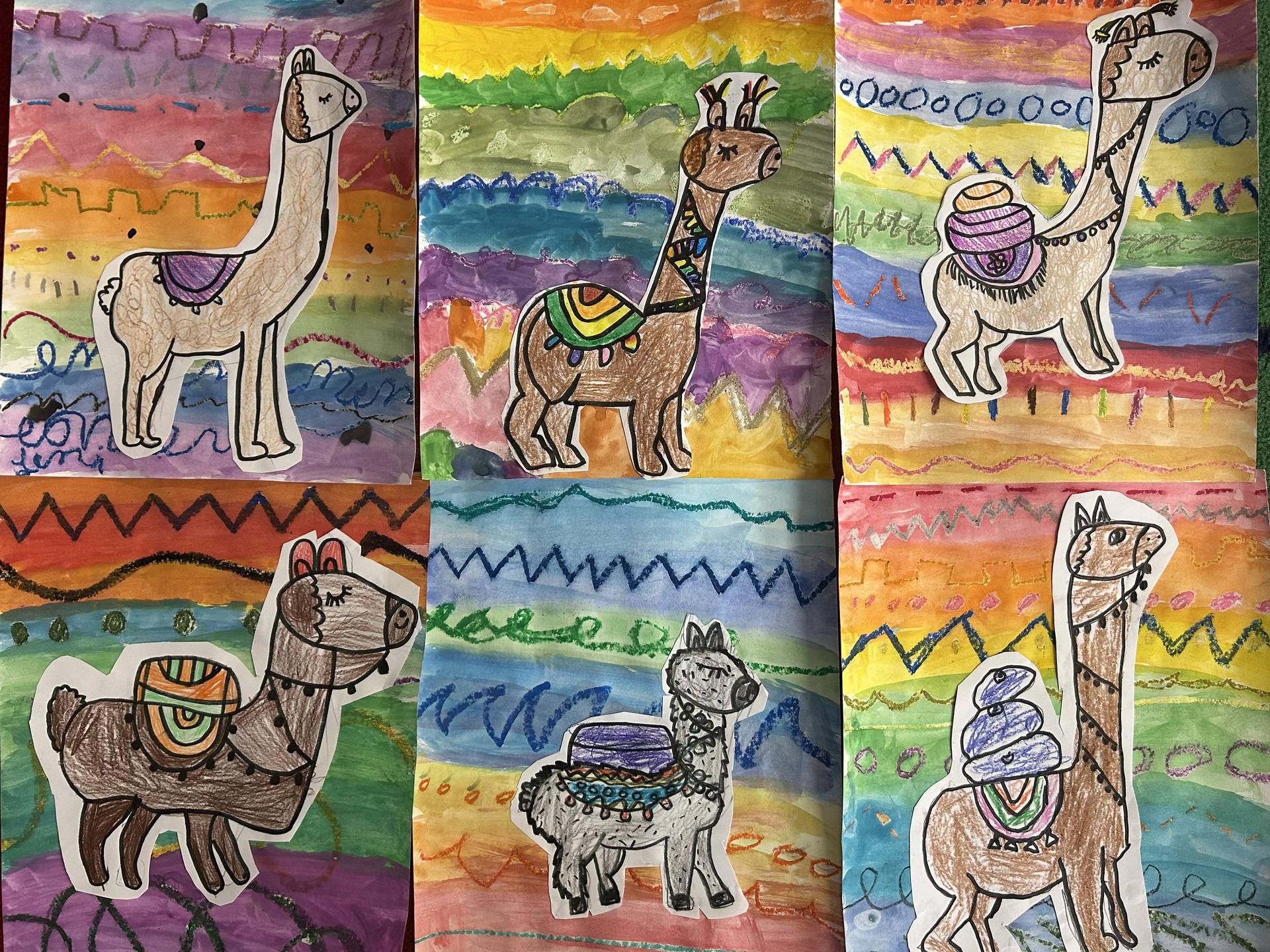 2nd grade artists learned all about different types of lines in their Line Llama project! They focused directly on drawing different types of lines for their background before using lines to draw a llama. And these artists truly blew me away when I saw how awesome their llama drawings turned out! They also got to experiment with an oil resist before they painted the backgrounds. They used oil pastels to decorate the background with lines before they painted with colorful watercolor paint on top, and because oil and water doesn’t mix you can still see all of the awesome lines beneath the paint!