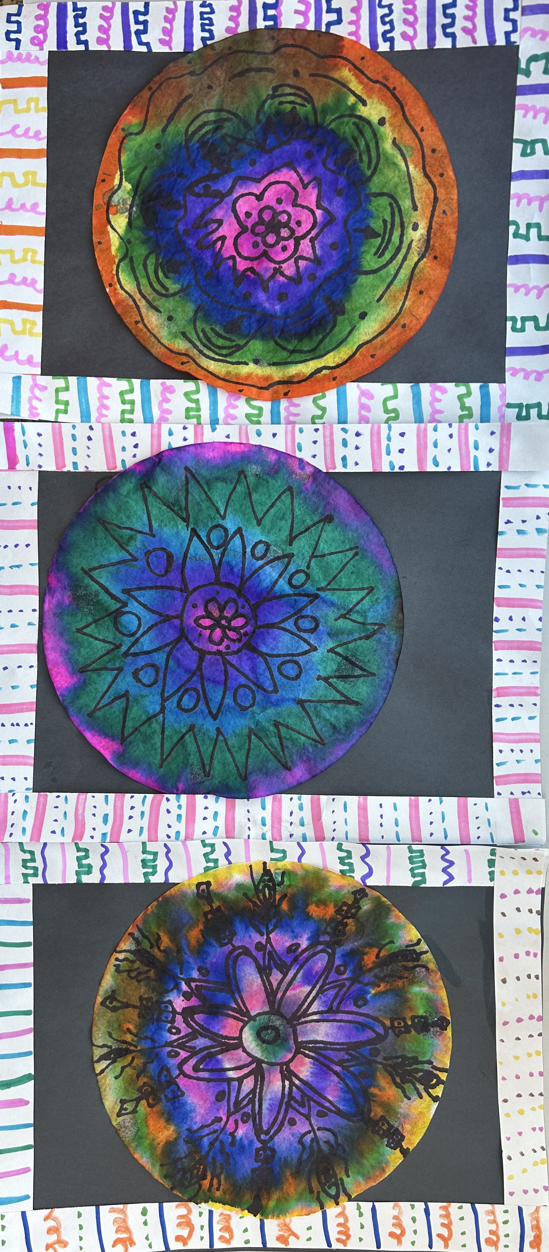 3rd graders “travelled” to India to learn about a popular type of art there, rangoli! Rangoli art is a traditional Indian art form using colored sand or powder to decorate a floor or courtyard during a special occasion such as a wedding! We looked at quite a few images of all the different amazing rangoli designs! Something the students talked a lot about was how this wasn’t a permanent artwork. The sand design could easily be blown away in the wind! We mixed the idea of rangoli art with India’s national bird, a peacock, to create this awesome art project!